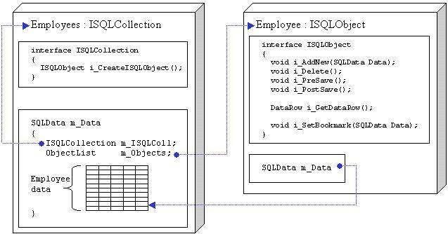 This is not, however, all SQLData can do for us. SQLData can act as a bookmark -- in this context, a reference to an individual row in a set of data. The term bookmark is not new, as the ADO Recordset has a property named Bookmark. One SQLData struct can act as a bookmark into another SQLData struct. An Employee object housed in a collection uses its local SQLData struct to point to a row in the Employees collection. For instance, an Employees collection object can retrieve all of the employee records from the database, then create an Employee object and instruct it to point to a row of data in the collection. The SQLData struct does all of this on behalf of the Employees collection by looping through the data in the underlying DataSet or DataReader and passing itself as a bookmark to the individual Employee object. Thus, an Employee object uses its SQLData to hold the actual data when it exists as an orphan or uses it as a bookmark into an Employees collection.