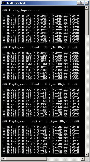 If you continue to examine the statistics, youll see that all of the Employees collection tests outperformed the tdsEmployees collection. More important was the Employees test using the values RWMode.Write and ObjectCreation.Unique combination. This collection has all of the same capabilities of the tdsEmployees collection (it actually has more). If you look at the garbage collection times associated with the tdsEmpoyees test, youll notice that they are quite a bit higher than the rest of the tests. I suspect after looking in detail at the tdsEmployees collection class that I know what is eating up the cycles, but I would hesitate to say until I know for sure.