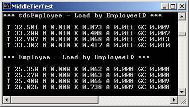 The statistics were gathered on a 600 MHZ Dell Inspiron 3800 laptop running Windows 2000 Server Edition - SP1 with 256 meg of ram. The test code was housed in a C# console application with both the MiddleTier namespace and the console application compiled for Release mode.
