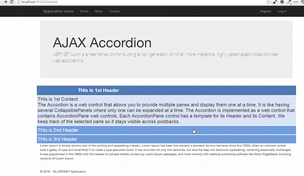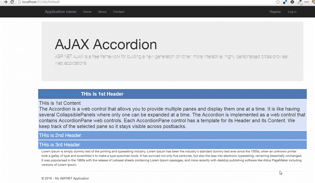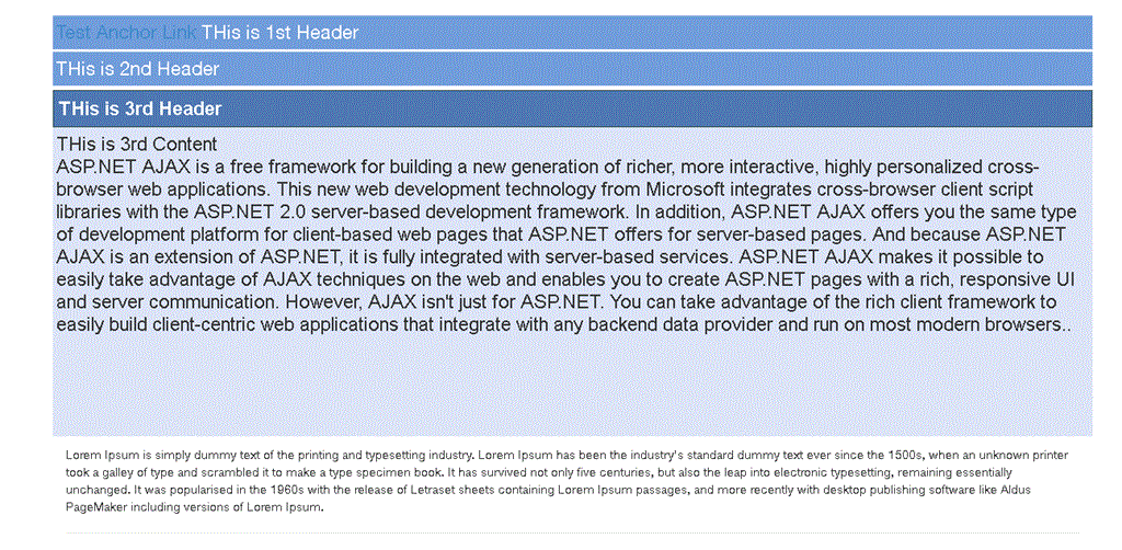 - <Content>THis is 1st Content <br />The Accordion is a web control that allows you to provide multiple panes and display them one at a time. It is like having several CollapsiblePanels where only one can be expanded at a time. The Accordion is implemented as a web control that contains AccordionPane web controls. Each AccordionPane control has a template for its Header and it’s Content. We keep track of the selected pane so it stays visible across postbacks. </Content>