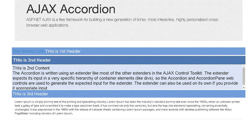 Accordion is also an extender control which can be placed in a container like div and so on. Extender controls are those controls which extend the functionality of your current work just as an example you have lot of paragraphs in a single page and you don’t have much space and want to summarize in small space then you need to embed to the div or some container which can hold all the information in accordion collapsible pans.