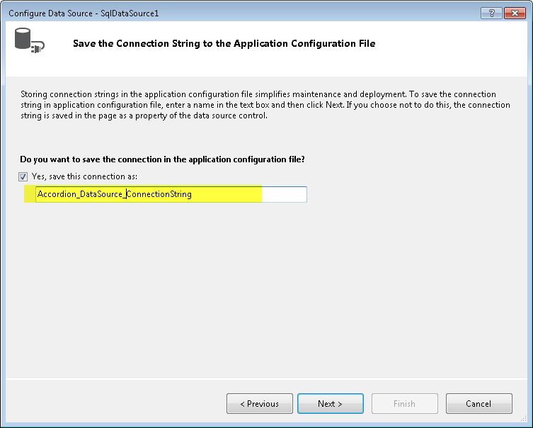 Now wizard will show do you want to save connection string to the configuration file if you select yes checkbox and give name to the connection string then it will save the connection string and name will be referenced in datasource.