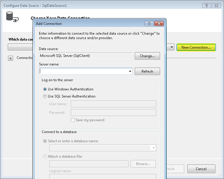 First of all Drag and drop SqlDataSource from Data Tab in the Toolbox to the designer view of the page and then Click the pointer arrow next to the control and click, it will extend it and select Configure Data Source it will open the Data Source Configuration Wizard which will guide you to create the connection string by connecting to the instance of the database.