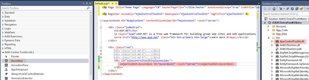 I have Created a New application and after installation of Ajax control toolkit I have dragged and dropped accordion control to the web form page of .aspx extension from toolbox.