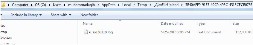 As you can see in this image while file is being uploaded it reside in the temp folder of default file temp path of Ajax file uploader which is C:\Users\yourusername\AppData\Local\Temp\_AjaxFileUpload.