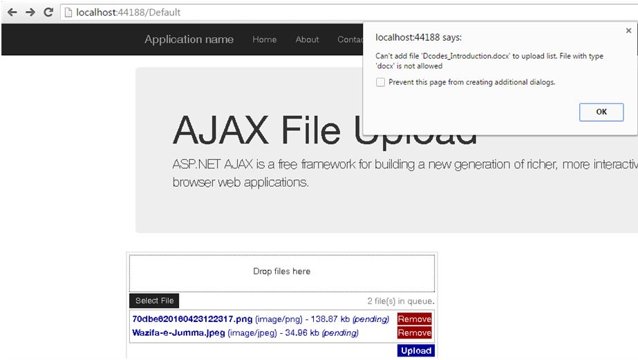 Another time consuming thing is to check the file types to be allowed or restricted in code, as we need to get the extension of the file and check correspondingly with code that it supports extension or not by showing custom message in the UI. But now Ajax file upload control bring easiness by using propertyAllowedFileTypes which can check the file types that are allowed to upload. The syntax is easy you have to mention against this property by separating the file extension by comma. Like this jpg, png, gif, docx.