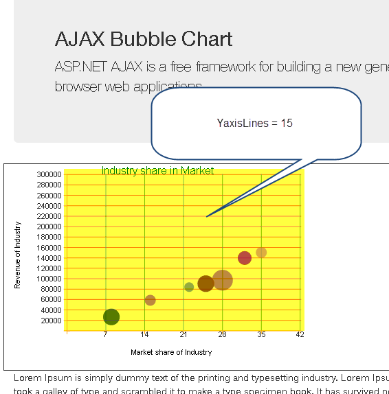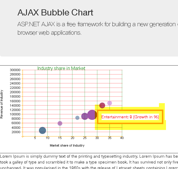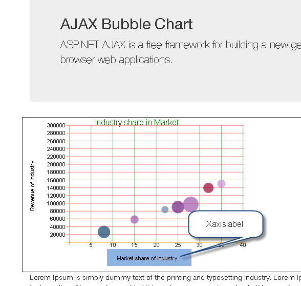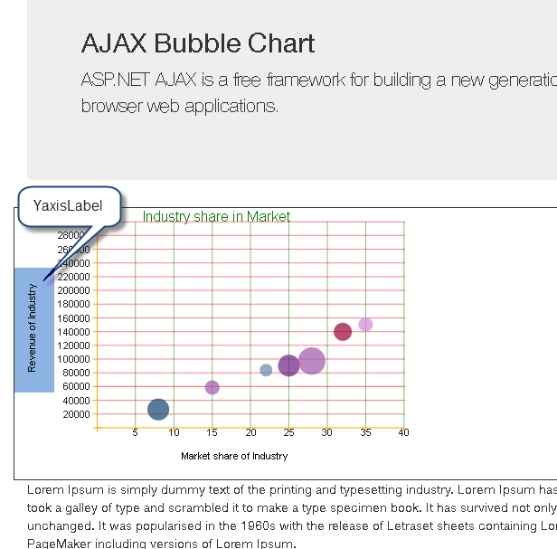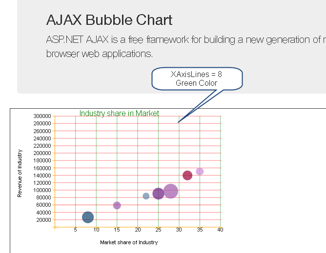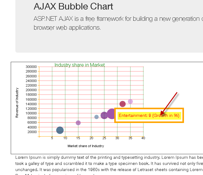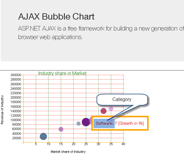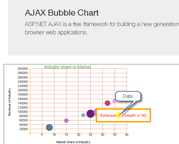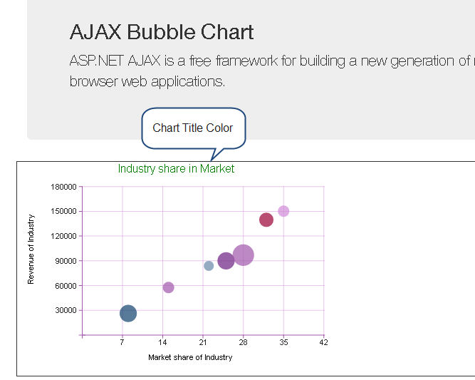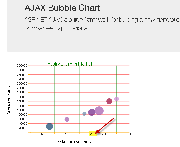 - <ajaxToolkit:BubbleChart ID="BubbleChart1" runat="server" ChartHeight="300" ChartWidth="450" ChartTitle="Industry share in Market" ChartTitleColor="Green" XAxisLineColor="Red" YAxisLineColor="Green" BaseLineColor="Orange" YAxisLines="15" XAxisLines="8" BubbleSizes="5" TooltipBackgroundColor="Green" TooltipBorderColor="Orange" TooltipFontColor="Red" XAxisLabel="Market share of Industry" YAxisLabel="Revenue of Industry" BubbleLabel=" (Growth in %)">