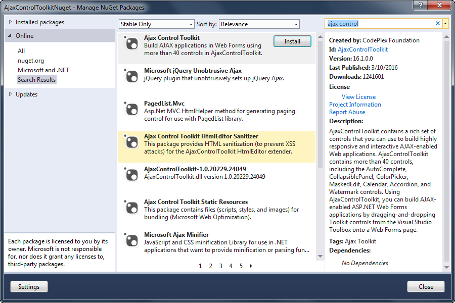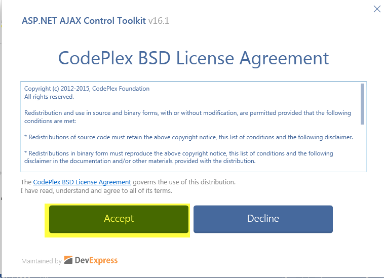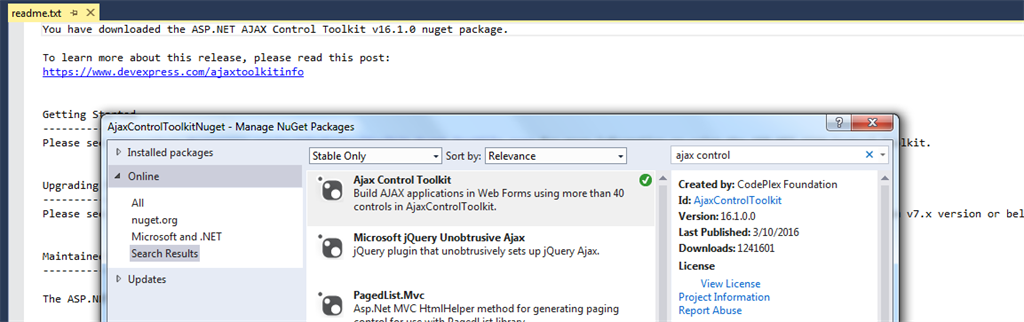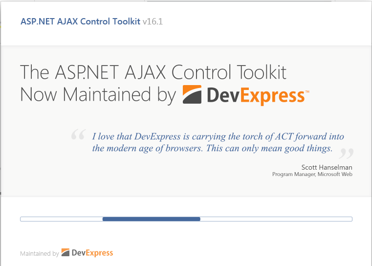 The ASP.Net AJAX Control toolkit is now maintained by DevExpress Team. The Current Version of ASP.Net AJAX Toolkit is v16.1.0.0. There are lot of new enhancement in the current version from new controls to bug fixes in all controls. You can check the full new list of features and fixes from here. The good thing is that now officially they moved to Github from Codeplex.