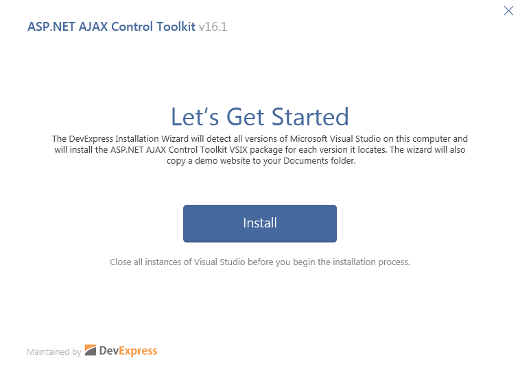The Installer wizard installs the VSIX package file while is the add-on file of the visual studio extensions. It installs them on the all Editions installed on your System and also creates a demo website containing all the demo of the controls and the extenders. But before proceeding to install it close all the instances of the visual studio.