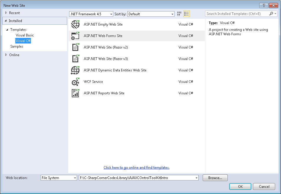 Press Ok it will create application with its all files. Now to check we have successfully installed Ajax control toolkit or not we well open the web form .aspx page and check by going into the Toolbox for available Ajax control toolkit controls and extenders.