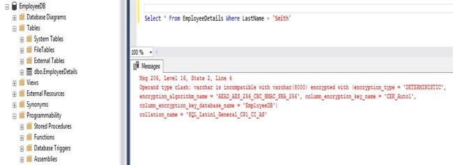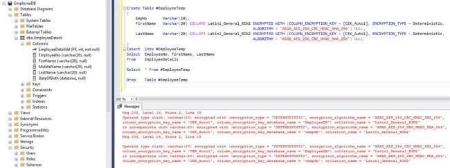 Ok, then let's see whether we can copy the data to the temp table. When you try to copy the data to the temp table, you will be prompted with a message saying the column encryption key does not exist or you do not have permissions since the keys were created on EmployeeDB.