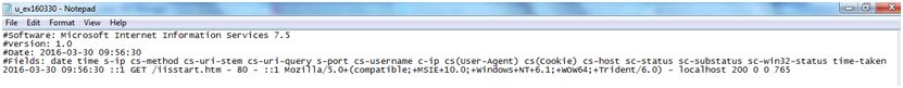 - IIS: This is ASCII text-based format, handled by HTTP.sys and fields cannot be customized Fields are separated by commas and time recorded in local time.