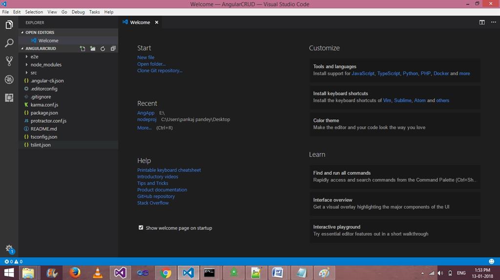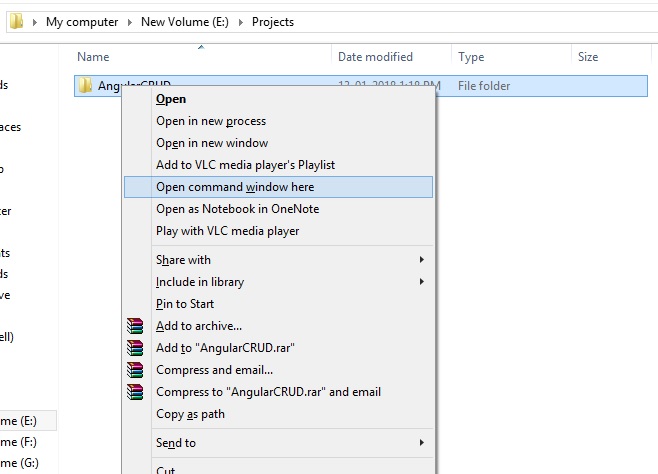 Create a new folder with any name, let's say, AngularCRUD. After the folder is created, then press ctrl+shift Right click for opening the command window here.