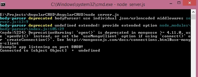 Let us open the project folder in other command prompt and run the node server.js on port 8080.