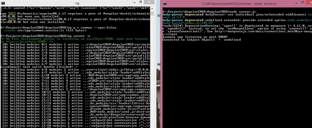 We are almost done for performing select, insert, update, delete operation. Now, let us run two servers. The first one is Angular application with command ng server-o and the second one is to open node.js server.