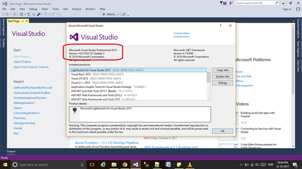 To verify your Visual Studio, open VS 2015. Click Help --> About Microsoft Visual Studio.