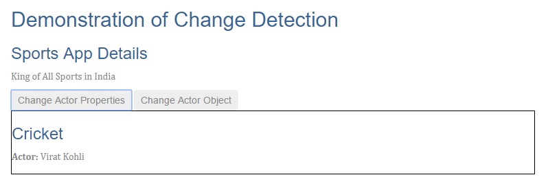 In the code snippet given above, we can see that our component defines two buttons, which triggers different methods. The changeProperties will update the lead sportsman of the sports by directly changing the properties of the sports object. In contrast, the method changeObject will change the information of the sportsman by creating a completely new instance of the Sports class. The Sportsman model is pretty straightforward, it is just a class, which defines the firstName and the lastName of a sportsman.