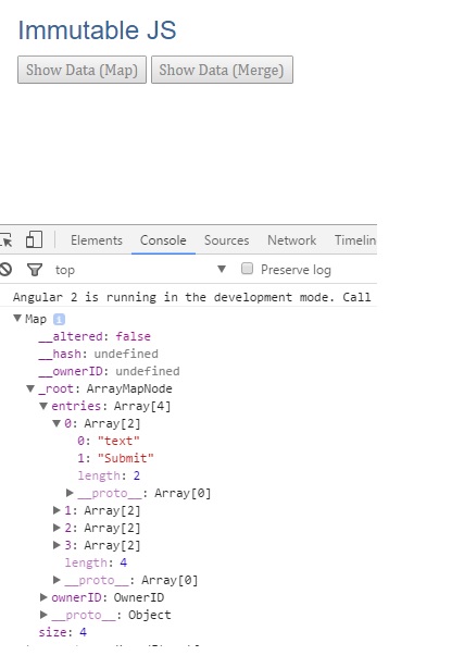 Map is the immutable version of JavaScript's object structure. Due to JavaScript objects having the concise object literal syntax, it's often used as a key-value store with the key being type string. This pattern closely follows the map data structure. Let's revisit the previous example, but use Immutable.Mapinstead.