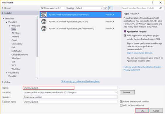 Open Visual Studio and select file, click new project, a new dialog will pop up with the name New Project. Select ASP.NET Web Application (.NET Framework), name your project and click OK button.
