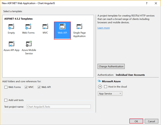 Now, new dialog will pop up to select the template. We are going to choose Web API and click OK.