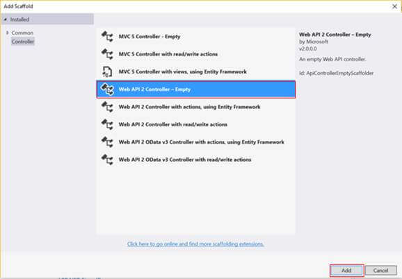 Now, we are going to create a controller. Right click on the controllers folder > Add > Controller> select Web API 2 Controller – Empty > click Add.
