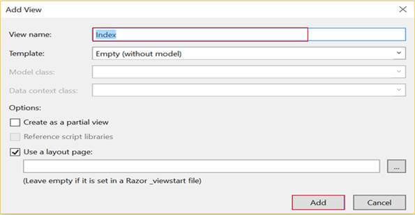 In Home controller, just right click on Index() action, select Add view and dialog will pop up.Write a name for your view and finally click Add.