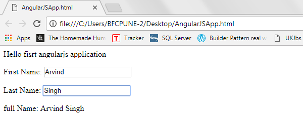 There are two textboxes - first name and last name, and an AngularJS expression for Full Name, when I type in the first name textbox, it displays in full name simultaneously and when I type in the last name, the AngularJS full name expression concatenates the first name and last name.