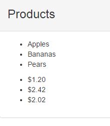 - $scope.products = [{ name: "Apples", category: "Fruit", price: 1.20, expiry: 10 },