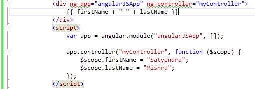 After creating a reference to module, we can work with inner variables in AngularJS application. In the above example, we can see that we are setting 'firstName' and 'lastName' variables using AngularJS Controller which is always dependent on module.