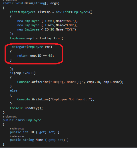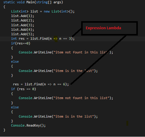 The example written with anonymous methods can be rewritten, using expression lambda. In the code given below, Find() method of generic List<T> class takes lambda expression to search.
