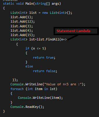 If the expression needs to process multiple lines of code, statement lambda can be used. In the example given below, FindAll() method of generic List<T> class is used. It returns all the elements, which match the conditions defined by the specified condition.
