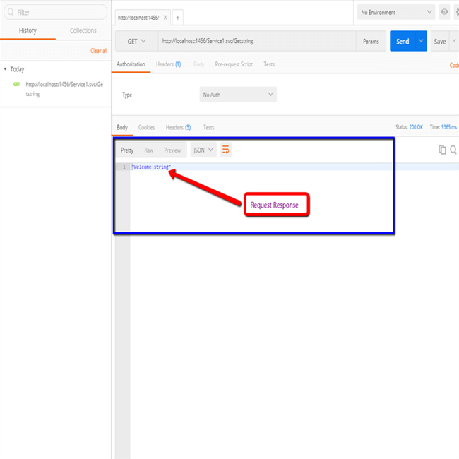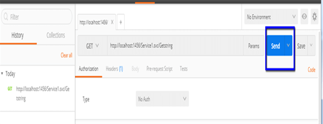 - First we execute the GET Method using postman. I have one GET API http://localhost:1456/Service1.svc/Getstring that would be executed with the postman. Please follow the below listed steps.