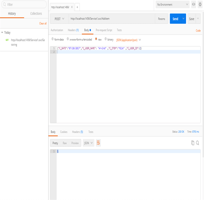 - Prepare one JSON formats (key:value) for these fours parameters like this {"C_DATE":"07/20/2017","C_USER_NAME": "Arvind" ,"C_ITEM":"Milk" ,"C_USER_ID":2}