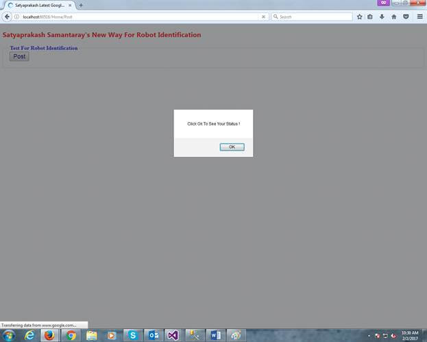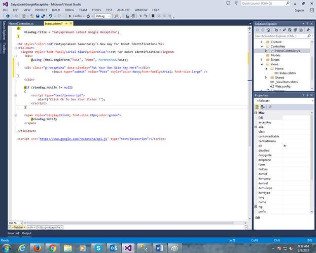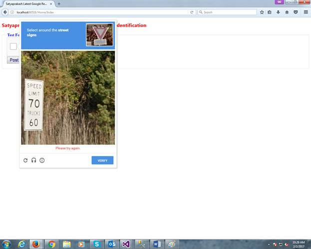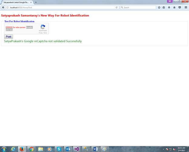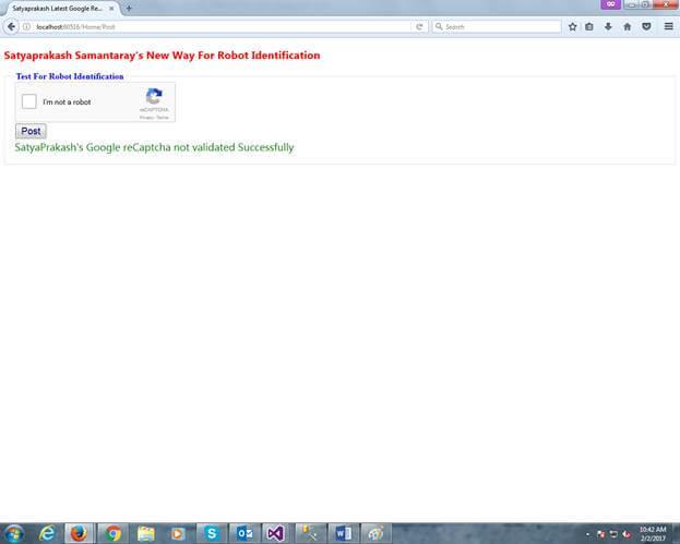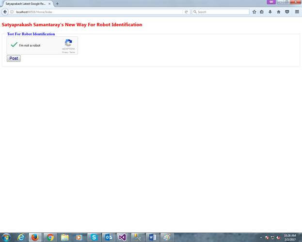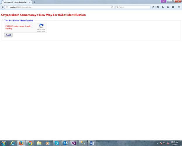 - } < h2 style = "color:red" > Satyaprakash Samantaray 's New Way For Robot Identification</h2> < fieldset > < legend style = "font-family:Arial Black;color:blue" > Test For Robot Identification < /legend> < div > @using(Html.BeginForm("Post", "Home", FormMethod.Post)) { < div class = "g-recaptcha"
