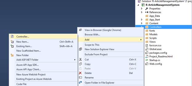 Now, its time to add a new controller -> Right click on Controller folder -> Add new controller.