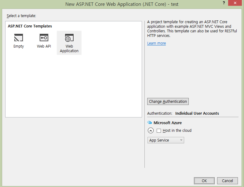 Next select Web Application. If you are not hosting in the Cloud then you can uncheck the Host in the Cloud at the bottom right corner. Click OK.