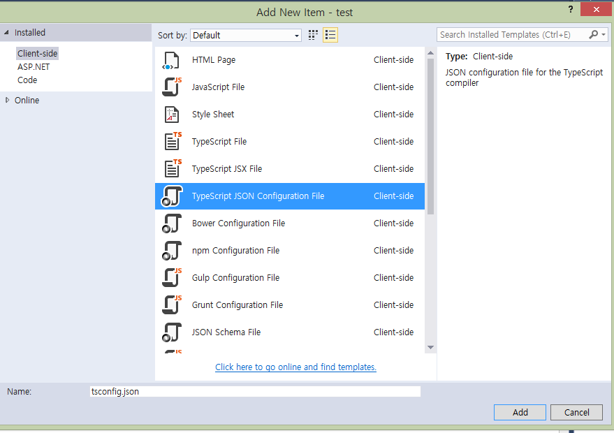 To create the TypeScript JSON file right click on your Project and Click Add new Item.