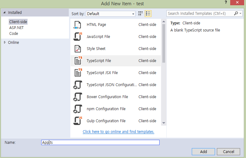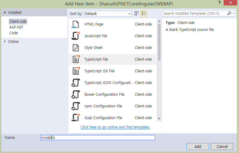 Right Click on Scripts folder and click on add new Item. Select TypeScript File and name the file as model.ts and click Add.