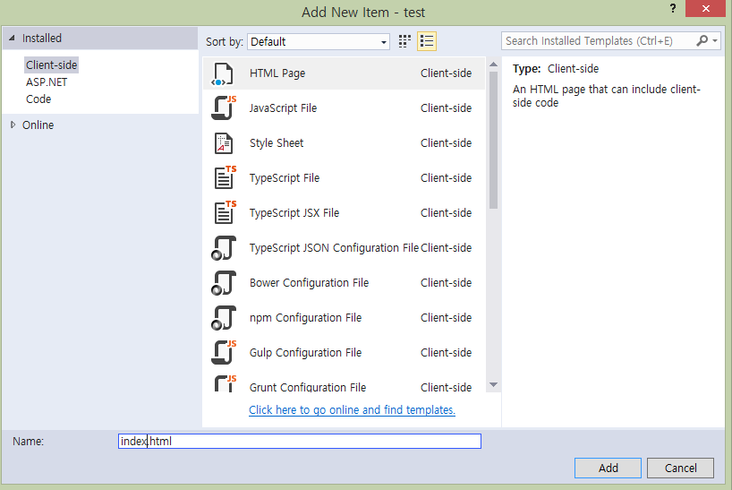 Next we need to create our html page to view result.To add the HTML file right click on wwwroot folder and click add new item, give the name as index.html and click Add.