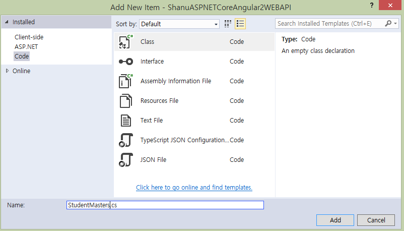 Right click the Models folder and click new Item. Select Class and enter your class name as “StudentMasters.cs”,