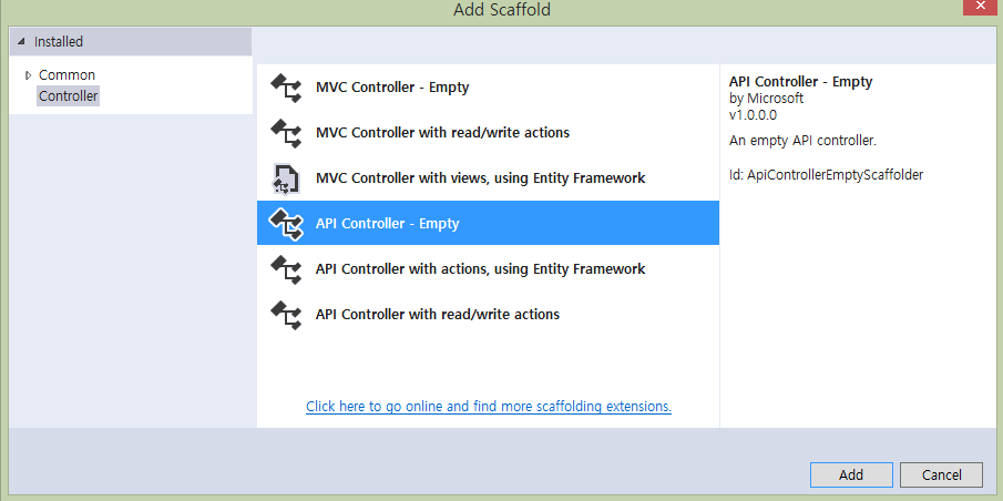 We can create a controller by adding a new Empty API Controller in our Controller Folder.