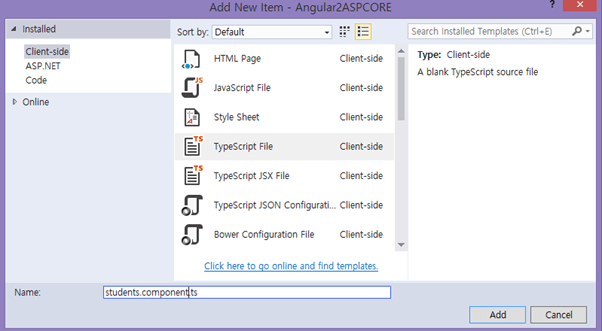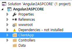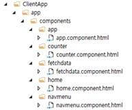 We can see a new folder ClientApp inside our project solution. This folder contains all Angular 2 related Applications like modules, components etc. We can add all our Angular 2 related modules, components, template HTML files, which are all under this folder. We can see in the details about how to create our own Angular 2 Application here as shown below in our article.
