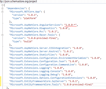 - "Microsoft.EntityFrameworkCore.SqlServer": "1.0.1","Microsoft.EntityFrameworkCore.Tools": "1.0.0-preview2-final"