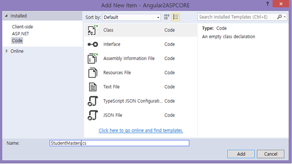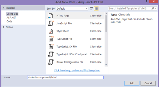 After installing all the prerequisites listed above and ASP.NET Core Template, click Start >> Programs >> Visual Studio 2015 >> Visual Studio 2015 on your desktop. Click New >> Project. Select Web >> ASP.NET Core Angular 2 Starter. Enter your project name and click OK.