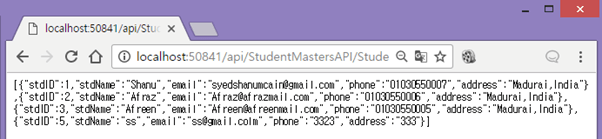 We will be using our SQL Server database for our WEB API and EF. First, we create a database named StudentsDB and a table as StudentMaster. Here is the SQL script to create a database table and sample record insert query in our table. Run the query given below in your local SQL Server to create a database and a table to be used in our project.