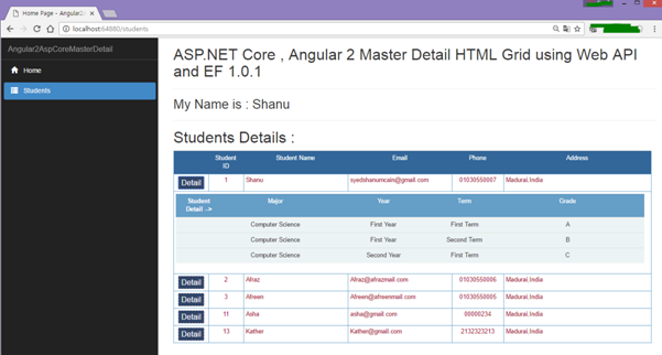 Build and run the application. You can see that our Students Master/Detail page will be loaded with all Student, Master, and Details information.