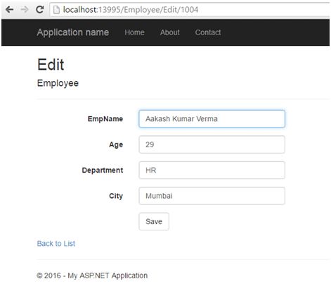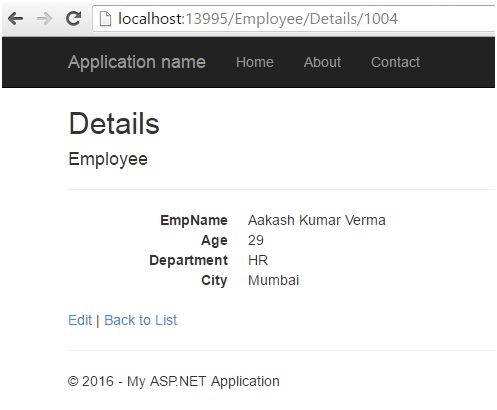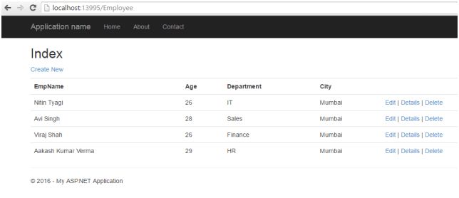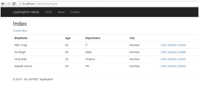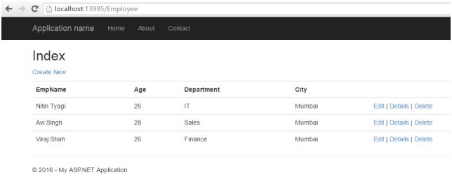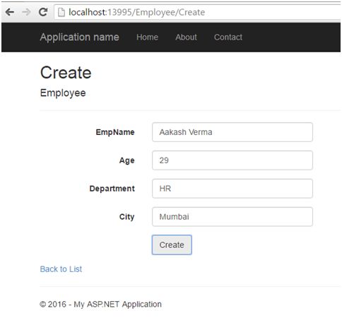 It has created all the methods to perform CRUD operations. Let us now run the Application and check if it is working fine or not. Browse the Application. Use Employee controller and create action, as it is a default action to create new records (Refer to controller code). Add sample data and click create.