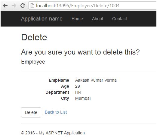 Let us check the delete functionality. Go back to the list and click delete. We get the following screen. Click Delete.