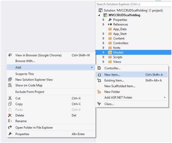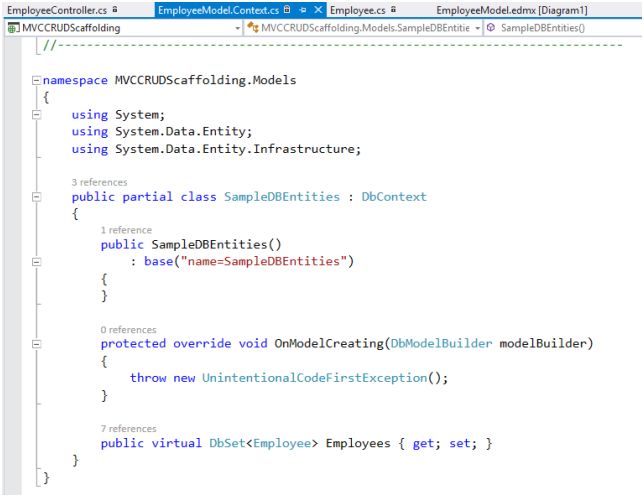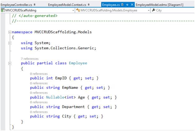 Let us have a quick view at the auto generated class files in the application. Following is the Employee class generated, using scaffolding.
