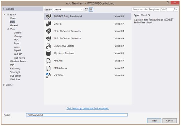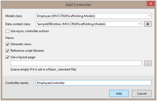Since we have Employee class as our model, we will select the same under Model Class and for the context, we would use the context class, generated by EF (SampleDBEntities). Click Add.